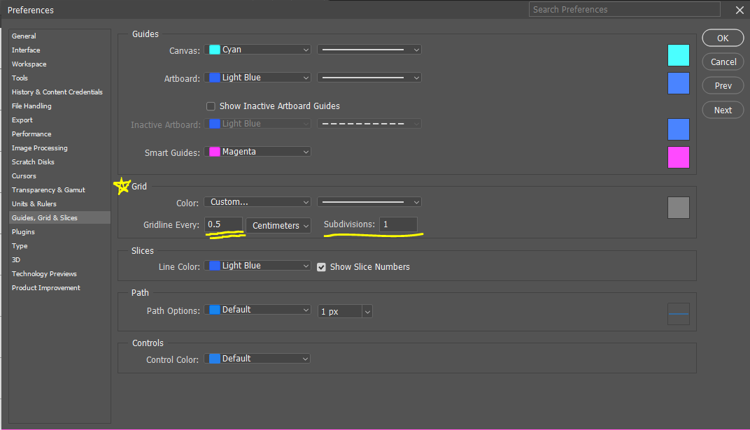 Choose Edit > Preferences > Guides, Grid & Slices ..